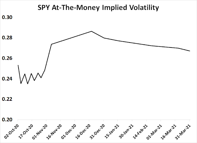 The market appears to be setting up for a prolonged period of heightened volatility. My survey of SPY at-the-money option pricing shows that implied volatility remains high and peaks out in mid-December, which is well after the election.