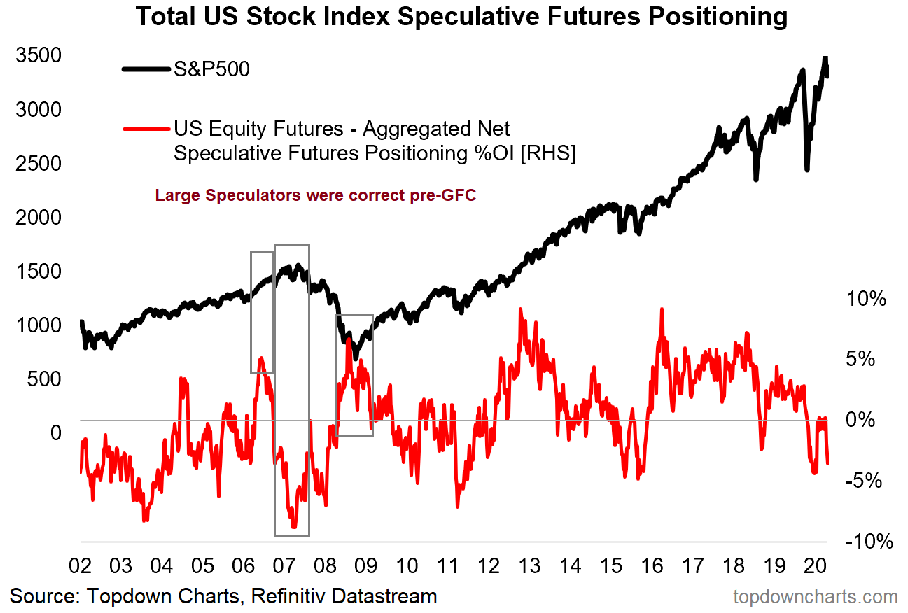 Here are some mitigating conditions to consider. Analysis from Callum Thomas revealed that, when normalized for open interest, the short position is not as extreme. Further analysis shows that large speculators were mostly correct in their positioning just before and during the Great Financial Crisis. This is a lesson not to be contrarian just for its own sake.