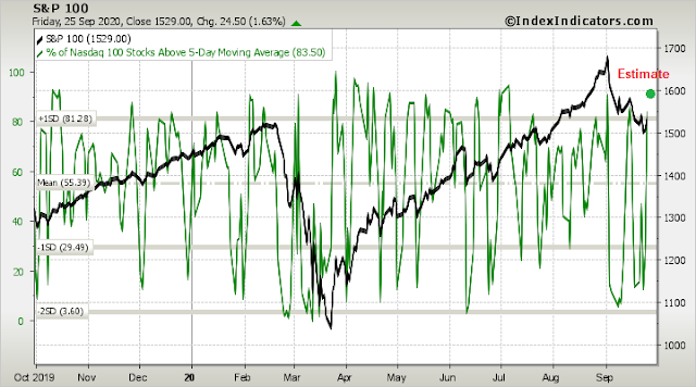 H Cam: I am starting with the assumption that large institutions, hedge funds and money managers trade the NDX(qqq) as opposed to Robin Hood traders. If that assumption is correct then the more appropriate measure of over-bought NDX will be % of Nasdaq 100 stocks above 10-Day moving average which is less volatile and allows for larger movements in the Index.