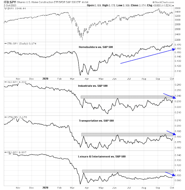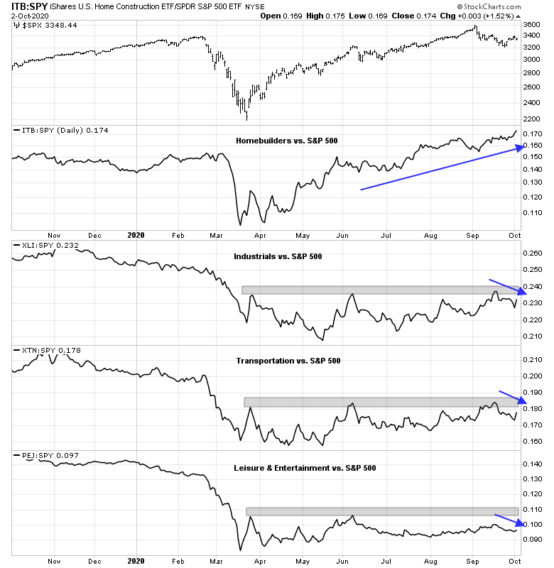 In the US, the relative performance of cyclical industries presents a mixed bag. Homebuilding stocks are on fire, which is reflective of the strength in housing. However, other cyclical groups such as industrial, transportation, and leisure and entertainment stocks, are stalling at relative resistance zones and exhibiting signs of relative weakness.