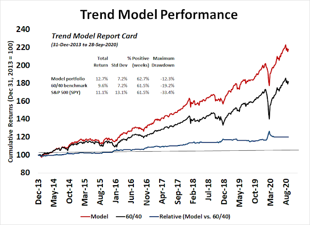 As a consequence, my Asset Allocation Trend Model signal has been downgraded from neutral to bearish. A simulation of actual Trend Model signals as applied to a simple over and underweight rules of 20% against a 60/40 benchmark has yielded equity-like returns with balanced fund-like risk.