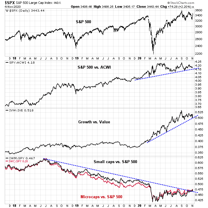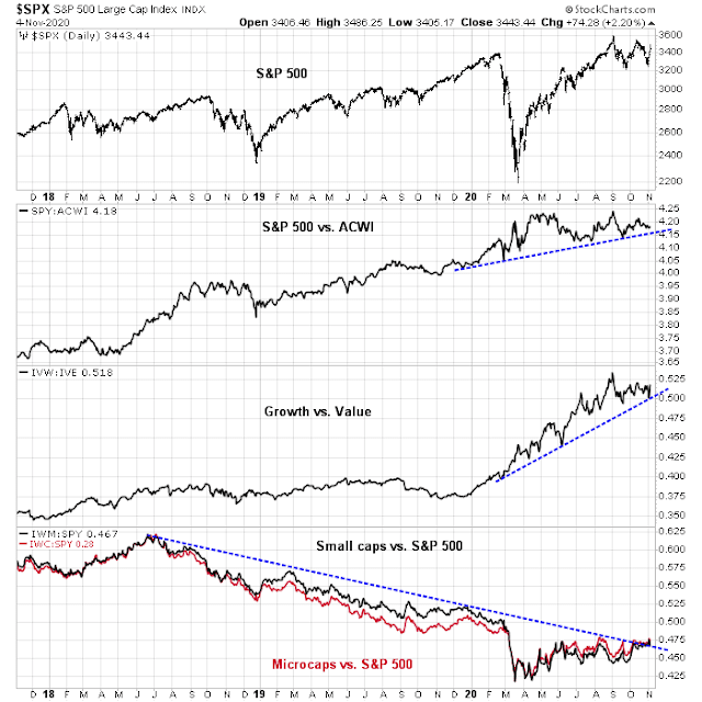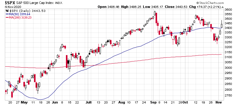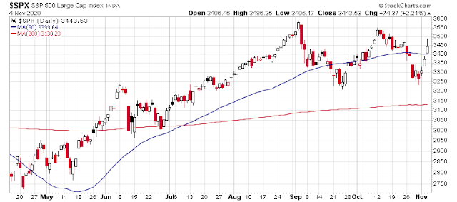 Mid-week market update: It’s always instructive to see how the market reacts to the news. If I had told you that the dual market nightmare scenarios of a contested election and a deadlocked election consisting of a Biden Presidency and a Republican-controlled Senate were to come true, would you expect the market to take a risk-on or risk-off tone?