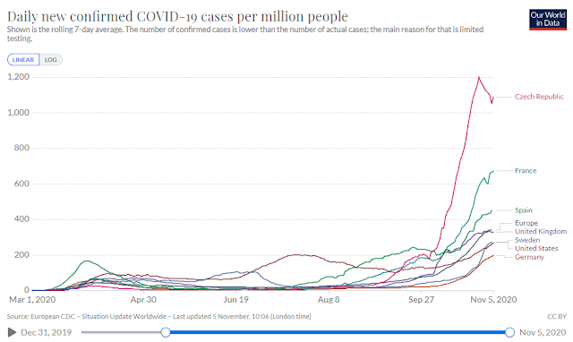 Let’s start with the bad news. Europe is experiencing a surge in COVID-19 cases. Member EU states have responded by going into lockdown. The worse afflicted are the Czech Republic, France, and Spain. Even Sweden, which was the poster child for light restrictions, is not immune to the second wave.