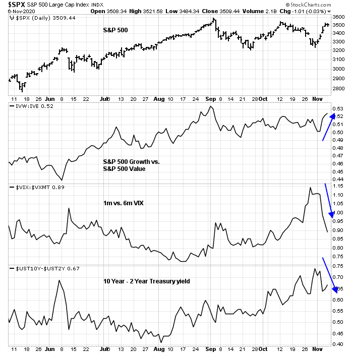 The analysis of market factors tells the story. As we approached the election, market anxiety rose, as evidenced by a steady rise in the 1-month VIX against the 6-month VIX. As well, the market began to anticipate the growth boost provided by a large fiscal stimulus of a Democratic sweep, as shown by a steepening 2s10s yield curve. Growth had been dominating Value but they lost their mojo as we approached the election. and growth/value traded sideways.