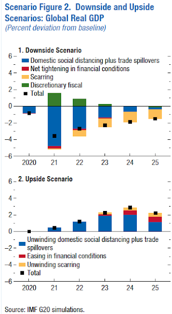 Under the upside scenario, it is assumed that all things in the fight against COVID-19 go much better than assumed in the baseline. On the treatment front, advances quickly start to reduce the fatality rate, reducing fear and helping to restore confidence. An early and substantial ramp-up in investment in vaccine production capabilities and cooperation agreements in the associated global supply chain lead to earlier, widespread vaccine availability. Complete openness and transparency in the underlying science increase confidence in vaccine efficacy and safety, leading to widespread vaccinations. All these advances will allow activity in the contact-intensive sectors, which have been most adversely affected, to bounce back more quickly than assumed in the baseline. In addition, the overall improvement in confidence will lead to higher spending across other sectors as uncertainty about future income prospects subsides. More buoyant activity will in turn lead to improved prospect for firms and less deterioration in fiscal positions, driving an easing in risk premiums. Further, the faster bounce-back will lead to fewer bankruptcies, less labor market dislocation, and a milder slowing in productivity growth than assumed in the baseline. The improvements in these supply side factors start in 2023 and grow. On the policy front, with the improvement in activity, fiscal withdrawal is assumed to be only in terms of automatic stabilizers, and monetary authorities everywhere are assumed to be able to accommodate the faster growth without imperiling their price stability objectives. Panel 2 in Scenario Figure 2 contains a decomposition of the impact on global GDP of the three key layers under the upside scenario.