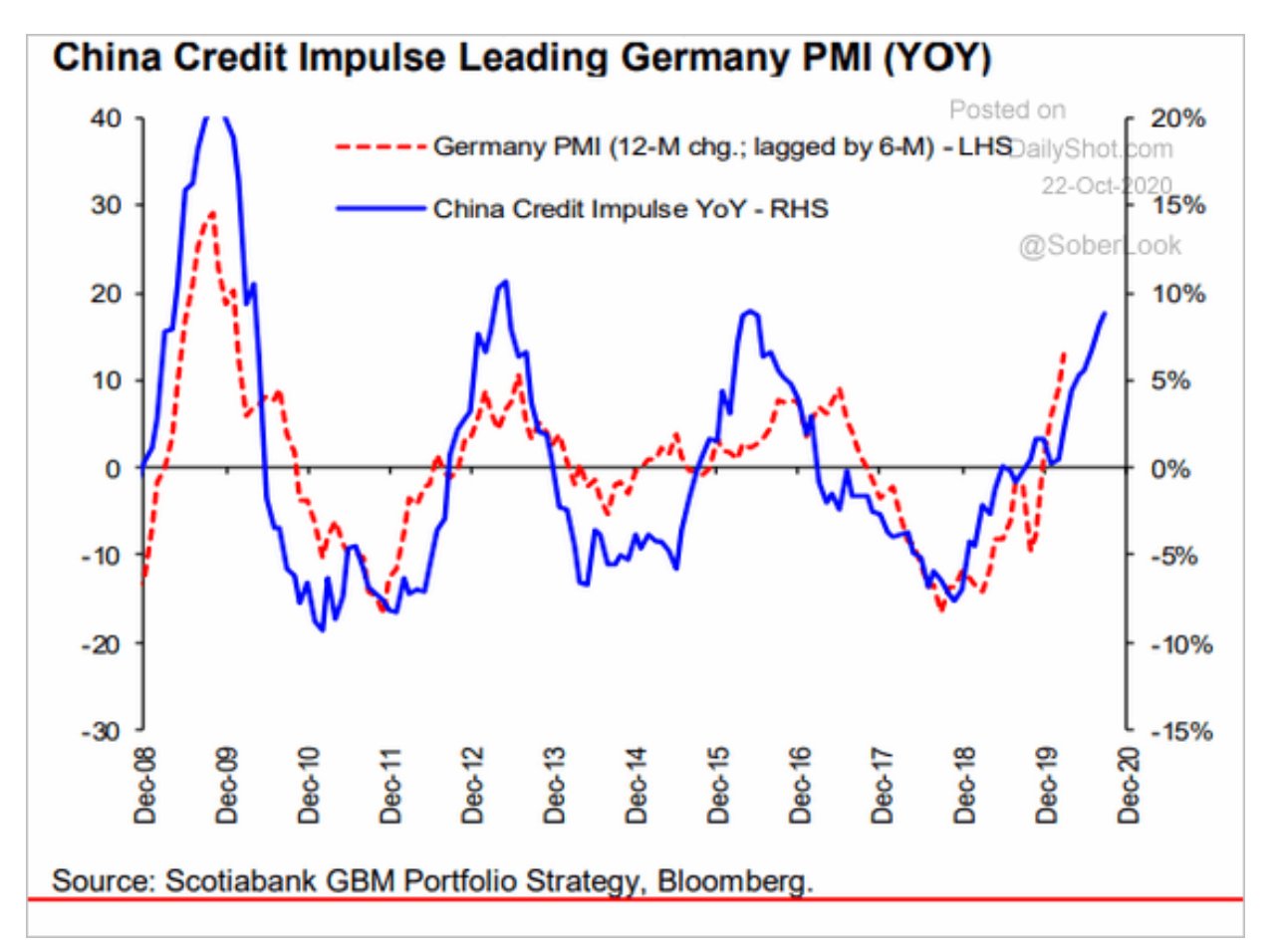 China’s economic recovery has proved to be a source of global demand that has become the locomotive for a global recovery. To be sure, the rebound was powered by a credit-fueled boost to production and not household consumption. Nevertheless, there is a strong lead-lag relationship between China’s credit impulse and German manufacturing PMI. Strength in China begets German, and therefore eurozone growth.