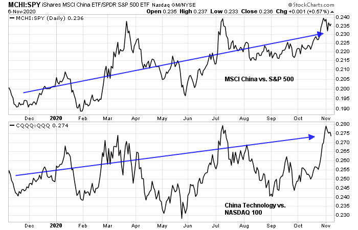 On a relative basis, MSCI China has outperformed the S&P 500 this year, and Chinese technology stocks have beaten the NASDAQ 100, albeit in a choppy manner.