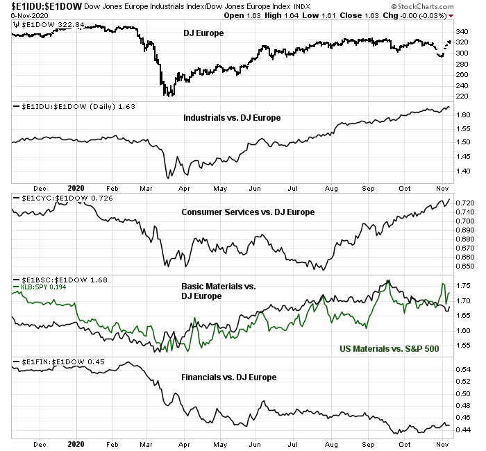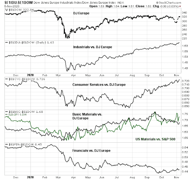 The stock market hasn’t reacted to these dire forecasts. The analysis of sector internals tells a different story. Cyclical sectors, such as industrials and consumer services are outperforming the market. Basic Materials stocks are tracing out a relative uptrend in a way that is similar to the Materials sector in the US.
