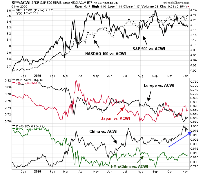 A glance at the chart of global relative performance shows that US markets were the former leaders but starting to weaken. Other developed markets, like Europe and Japan, have been trading sideways relative to the MSCI All-Country World Index (ACWI). It is China that has emerged as the new leadership (bottom panel).