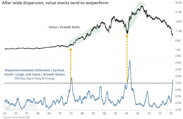 An analysis of the trade setup indicates that upside potential is significant. Historically, relative style performance such as value/growth is long-lasting and the magnitude of gains significant when the dispersion in style returns are large and begin to mean revert.