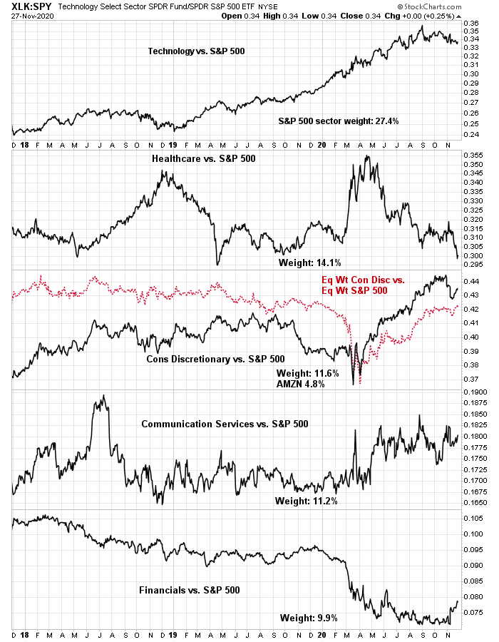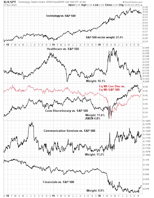 Despite the cyclical and reflationary tailwinds for stocks, the S&P 500 has a weighting problem. About 44% of its weight is concentrated in Big Tech (technology, communication services, and Amazon). The top five sectors comprise nearly 70% of index weight, and it would be difficult for the index to meaningfully advance without the participation of a majority of these sectors. However, an analysis of the relative performance of the top five sectors does not exactly inspire confidence as to the sustainability of an advance. Technology relative strength, which is the biggest sector, is rolling over. Healthcare is weak. Neither consumer discretionary nor communication services are showing any signs of leadership. Only financial stocks, which represent the smallest of the top five sectors, is exhibiting some emerging relative strength.