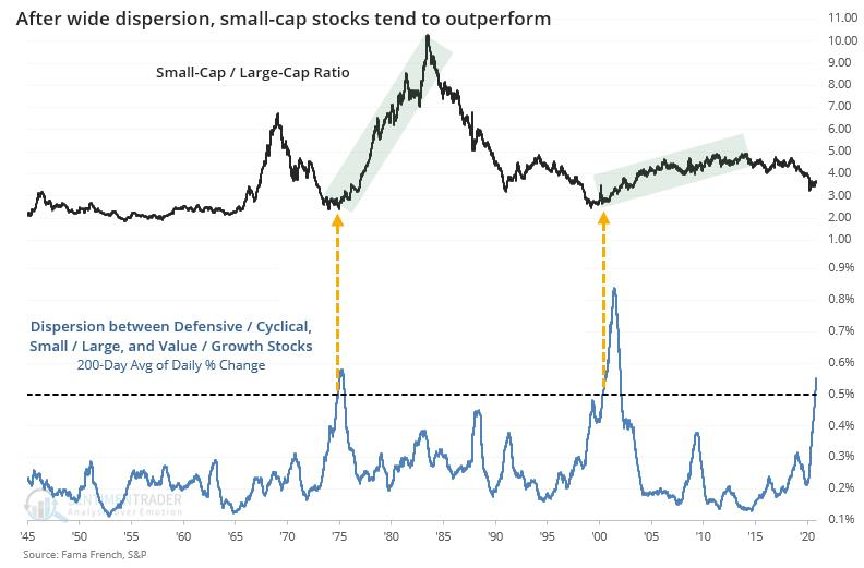 A similar reversal effect can be seen for the size effect, or the small vs. large-cap relationship.