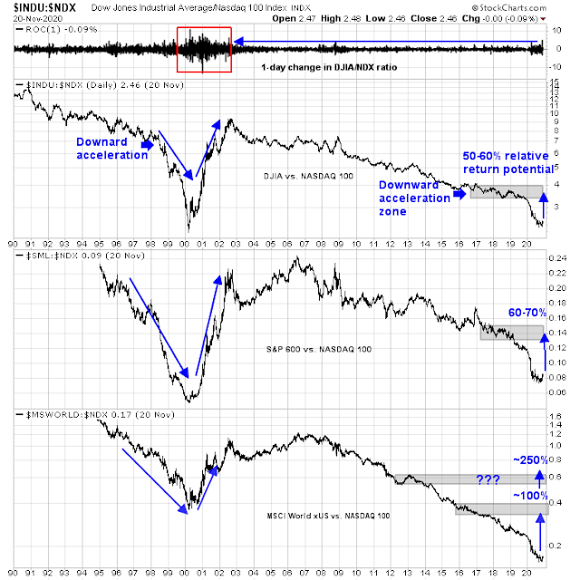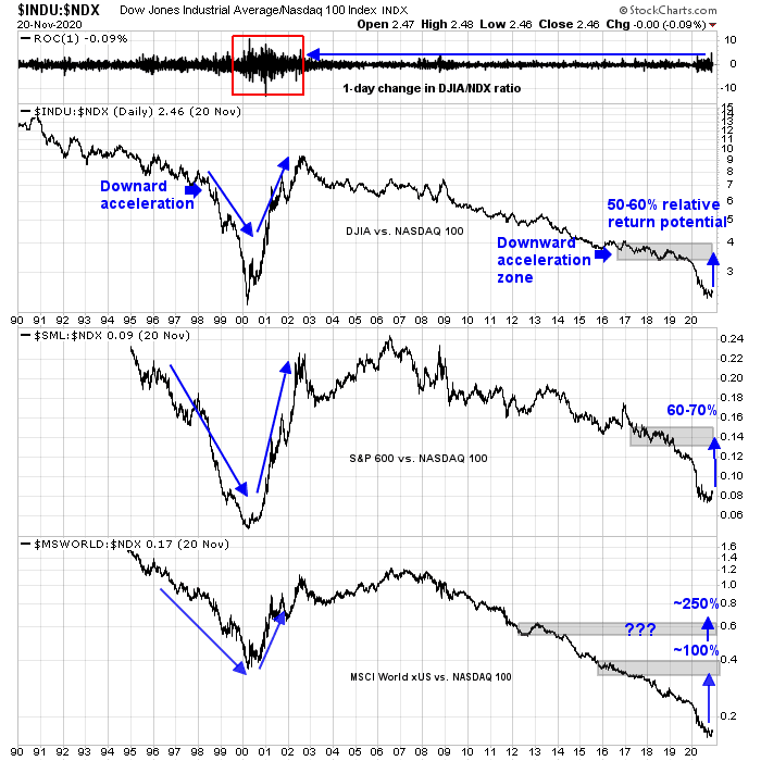 - Relative Return Magnitude Potential: The dot-com experience saw the DJIA/NASDAQ 100 plunge and mean revert to a level just above the spot when the ratio began to accelerate downwards, indicating the start of an investing mania. The magnitude of the current episode of downward acceleration was not as severe, and therefore the snapback should be less than the dot-com era.