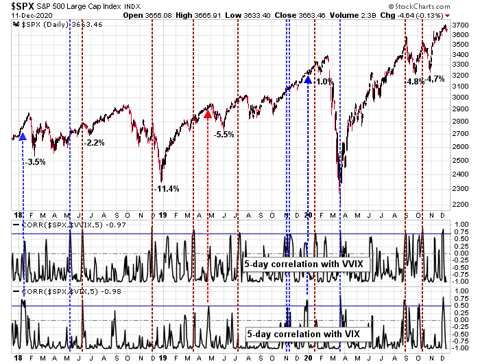 I have also been monitoring the recent surge in correlations between the S&P 500 with the VIX Index, and the VVIX, or the volatility of the VIX. We have seen 14 similar warnings in the past three years. Eight episodes were resolved in a bearish way (red vertical lines), and six saw the market either consolidate sideways or continue to rise (blue lines). On the occasions when the market has pulled, back the average drawdown from the initial date of the signal was -4.9%.