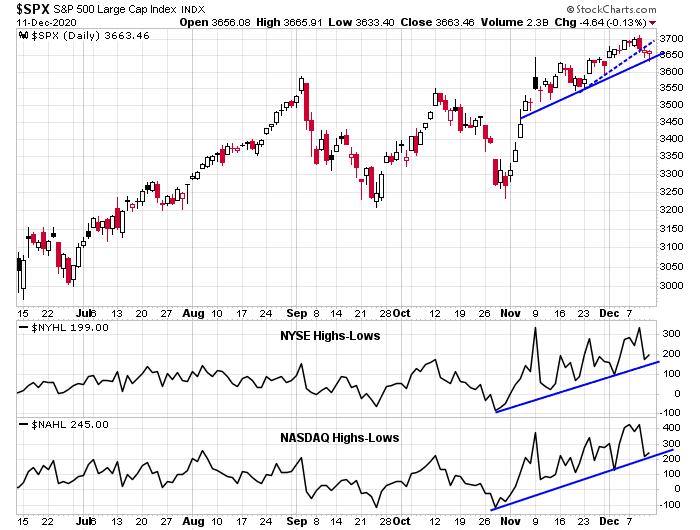 The bulls suffered a setback when the S&P 500 violated a minor rising uptrend (dotted line), though secondary uptrend support (solid line) is holding at 3640. Before anyone panics, the uptrends in the S&P 500 and breadth indicators are intact. In all likelihood, the market is just undergoing a period of consolidation since the start of December.