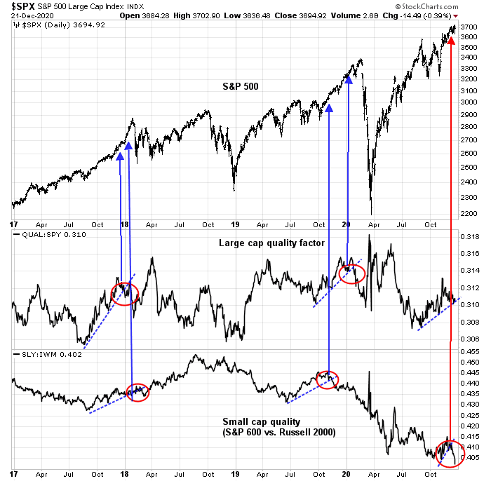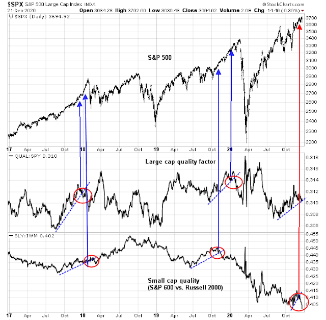 We already had an early warning from my quality factor tripwire. The past two melt-ups have ended with low-quality stock leadership. Low-quality small caps have already flashed a bearish signal. Large cap quality remains in a relative uptrend. Will it signal a correction too? The low-quality factor has been early to warn of market tops in the past.