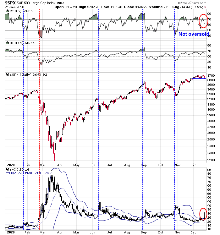 What should traders make of the pre-Christmas panic today? S&P 500 futures were down as much as -2.5% overnight. The market opened up down about -1.5%, but recovered most of its losses to a -0.4% retreat today. More importantly, the bulls were able to hold support at 3650.
