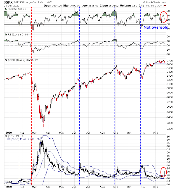 The VIX Index surged above its upper Bollinger Band, which is a sign of an oversold market. In the past year, most of the similar instances saw the market either rise or stabilize after VIX upper BB readings (blue vertical lines). The only exception occurred in February, when the market cratered as the news of the pandemic spooked risk appetite (red line). On the other hand, the 5-day RSI (top panel) is nowhere near an oversold condition.