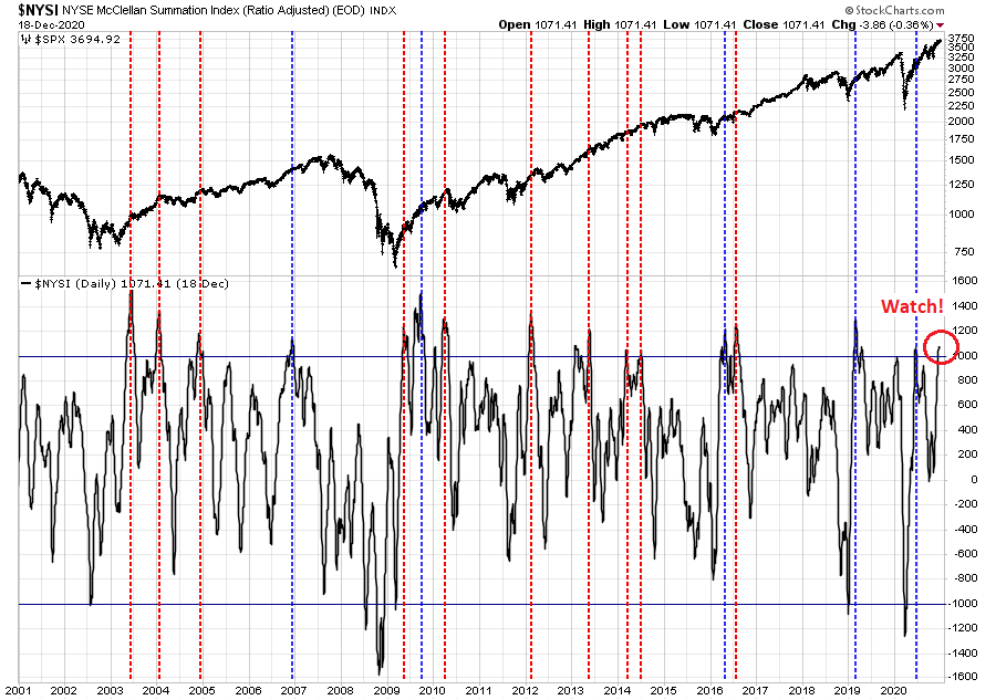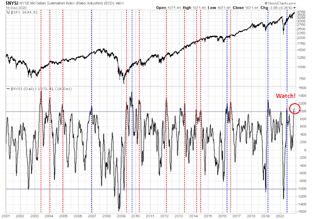 I am also watching the NYSE McClellan Summation Index (NYSI). In the last 20 years, NYSI readings of over 1000 have signaled either sideways consolidations or corrections about two-thirds of the time (red vertical lines). But market weakness does not occur until NYSI definitively rolls over. We are not there yet.