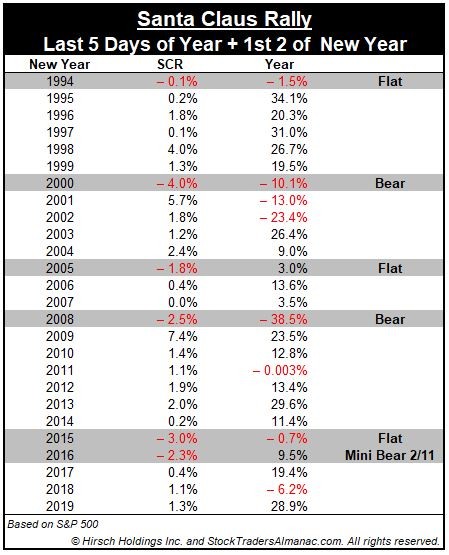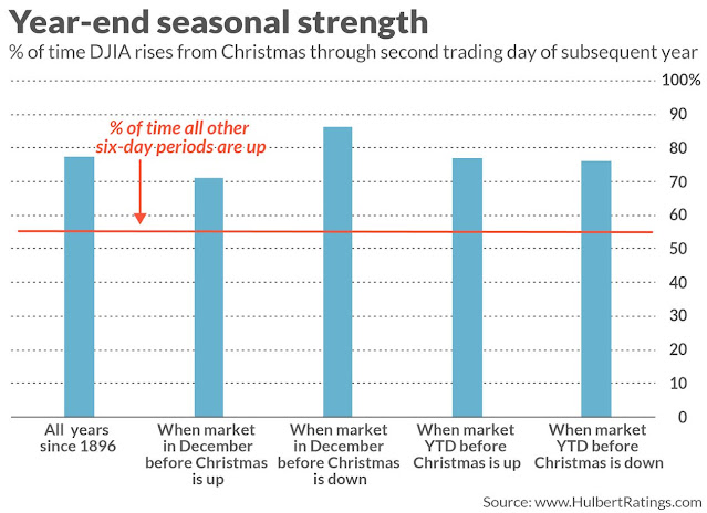 Arguably, the real seasonally positive Santa rally starts now. Mark Hulbert defined it as the six trading days after Christmas. Going back to the Dow’s inception in 1896, Hulbert found that the DJIA rose 76.6% of the time during this period, compared to 55.7% for all other six-day periods.