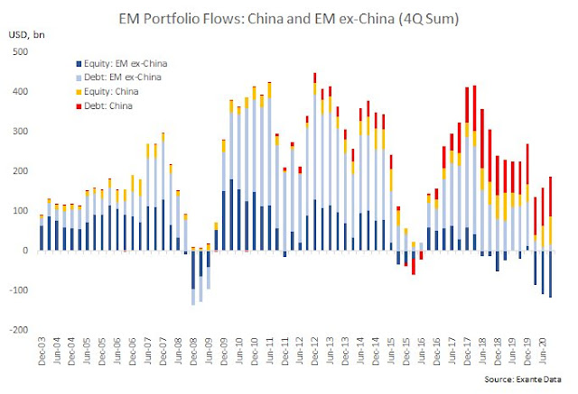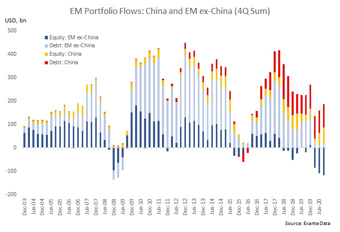 However, the analysis of fund flows show that EM xChina equity flows are net negative for 2020. These stocks are still under-owned, indicating substantial potential for outperformance.