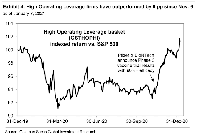 Signs are growing that the expectations of a cyclical recovery has grown too far, too fast. In a recovery, companies with high financial and operating leverage should perform well, and indeed the high operating leverage basket has rocketed upwards against the S&P 500 since Vaccine Monday. Cyclical stocks may have risen too far, too fast.