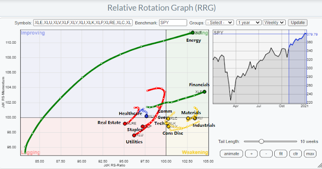 For the purposes of analyzing change in leadership, I use the Relative Rotation Graphs, or RRG charts, as the primary tool for the analysis of sector and style leadership. As an explanation, RRG charts are a way of depicting the changes in leadership in different groups, such as sectors, countries or regions, or market factors. The charts are organized into four quadrants. The typical group rotation pattern occurs in a clockwise fashion. Leading groups (top right) deteriorate to weakening groups (bottom right), which then rotates to lagging groups (bottom left), which changes to improving groups (top left), and finally completes the cycle by improving to leading groups (top right) again.