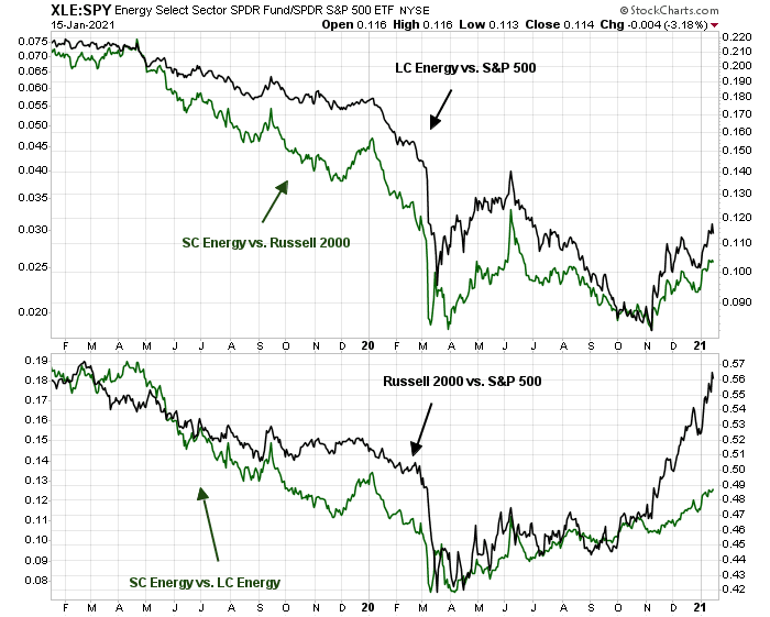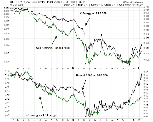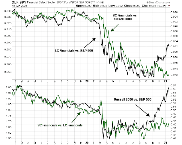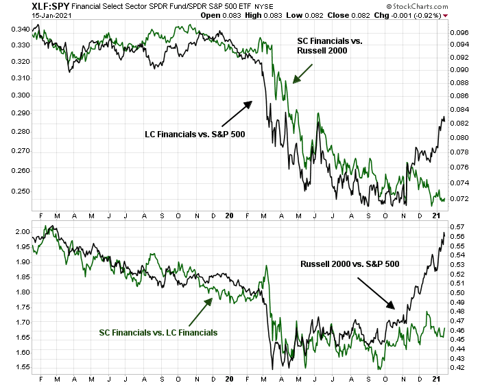 A closer examination of the two leading sectors, energy and financials, reveal some key differences. Both large and small cap energy stocks are beating their respective benchmarks and showing similar patterns (top panel), but the degree of outperformance of small to large cap energy (bottom panel, green line) lags the relative performance of the Russell 2000 to S&P 500. If energy stocks are to remain market leaders, there may be some opportunity in small cap energy.