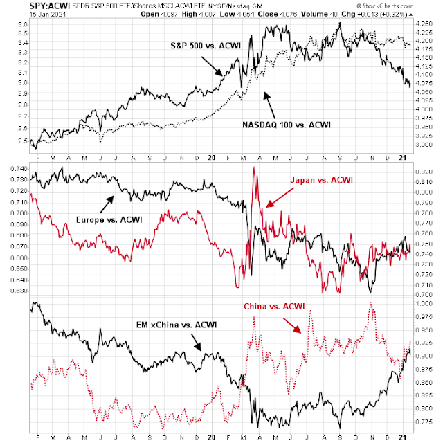 A more detailed analysis of relative performance against the MSCI All-Country World Index (ACWI) shows that the S&P 500 and NASDAQ 100 losing steam, major developed markets like Europe and Japan trading mostly sideways, and EM xChina the best relative performer. EM xChina’s strong relative performance is mainly attributable to that region’s high cyclical exposure, though the region may be vulnerable in the short-run owing to the extended nature of the recent rally.