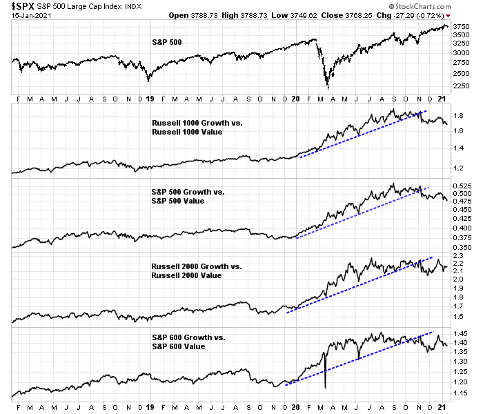 From a sector perspective, investors should focus on value stocks. The relative performance recovery of large and small cap value, however they are measured, are intact.