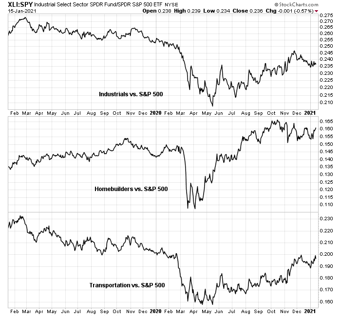 The big surprise from the RRG chart was the deterioration in relative strength seen in cyclical sectors such as materials and industrials. In theory these sectors should be performing well as the global economy recovers from the pandemic. Instead, the relative performance of cyclical sectors and industries have begun to flatten out.