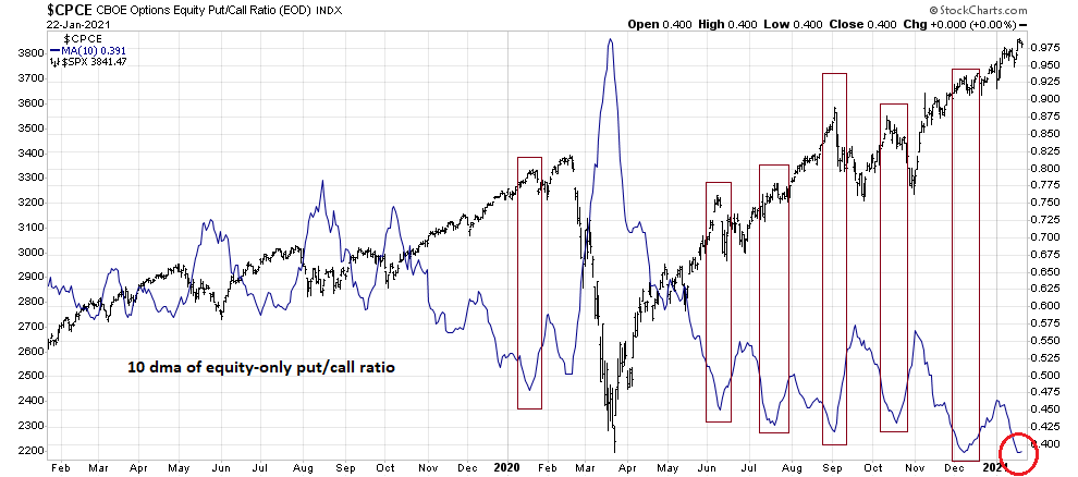 The 10-day moving average of the equity-only put/call ratio is nearing its lows again, indicating excessively bullishness. At a minimum, recent low reading episodes have resolved themselves in pullbacks.