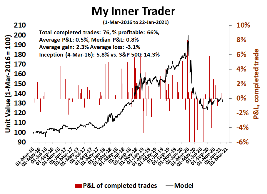 My inner trader uses a trading model, which is a blend of price momentum (is the Trend Model becoming more bullish, or bearish?) and overbought/oversold extremes (don’t buy if the trend is overbought, and vice versa). Subscribers receive real-time alerts of model changes, and a hypothetical trading record of the email alerts are updated weekly
