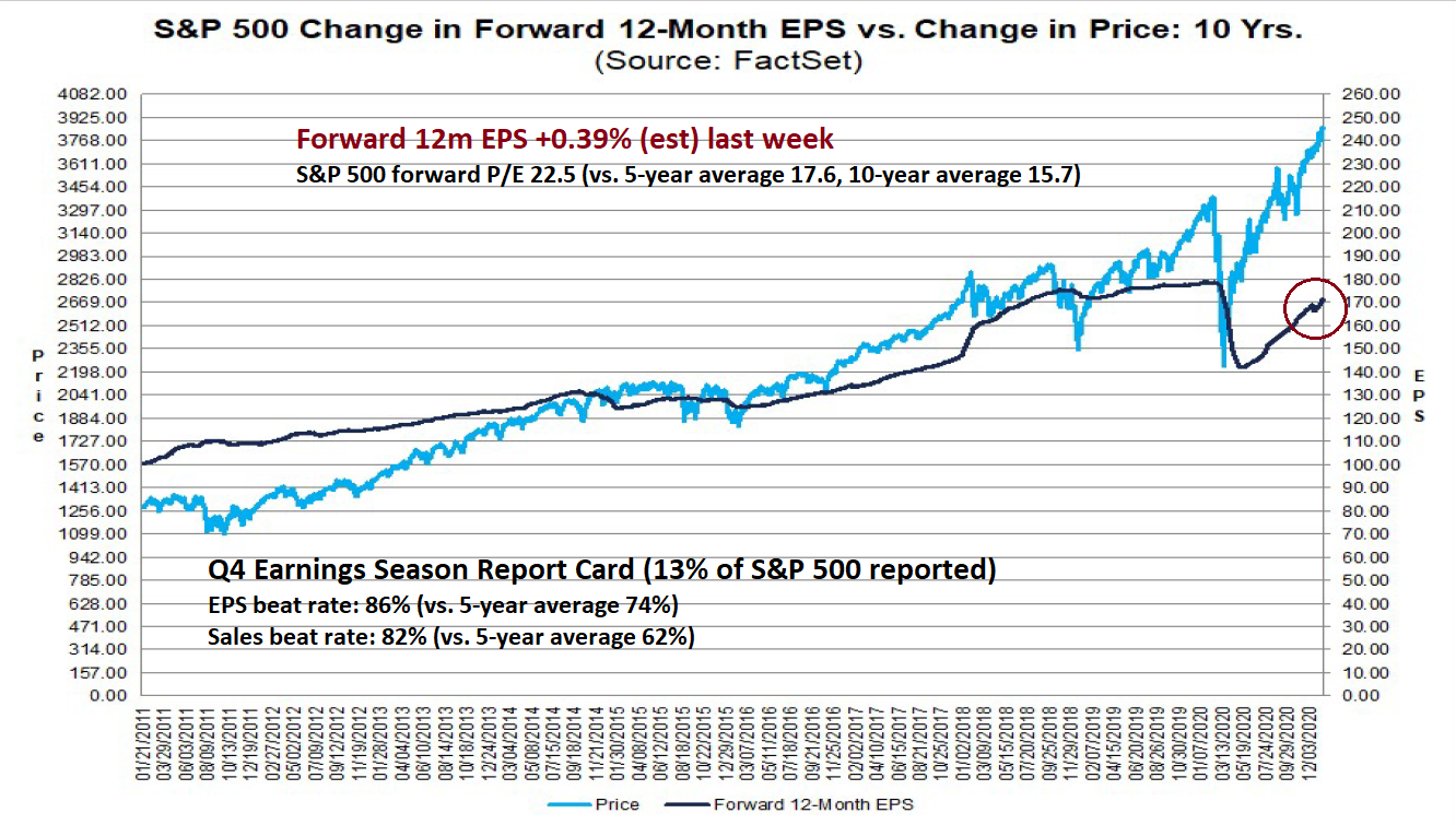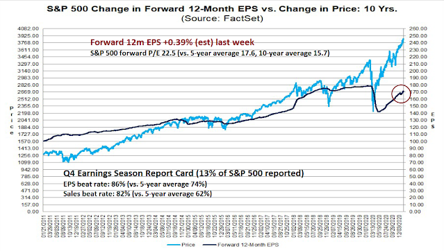One of the bright spots for the market bulls could be Q4 earnings season. FactSet reported the good news: Both EPS and sales beats are strong and above historical norms. Company analysts are revising their EPS estimates upwards, which should be a sign of strong fundamental momentum and bullish.