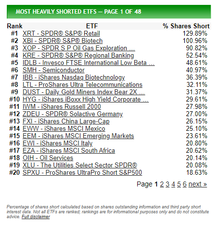 Instead of looking for short squeeze opportunities in individual stocks, have you considered a list of the most shorted ETFs? These represent possible contrarian plays in unloved industries that may be poised to move up. For the purposes of this analysis, I focus on the top four, with the cutoff being 50% or more of the shares sold short.