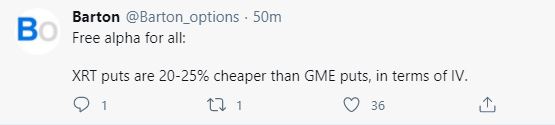 The first ETF on the list, XRT, can be ignored as it represents a synthetic way of shorting GME. GME represents roughly 10% of XRT. For what it’s worth, there may be an arbitrage opportunity between XRT and GME put options.
