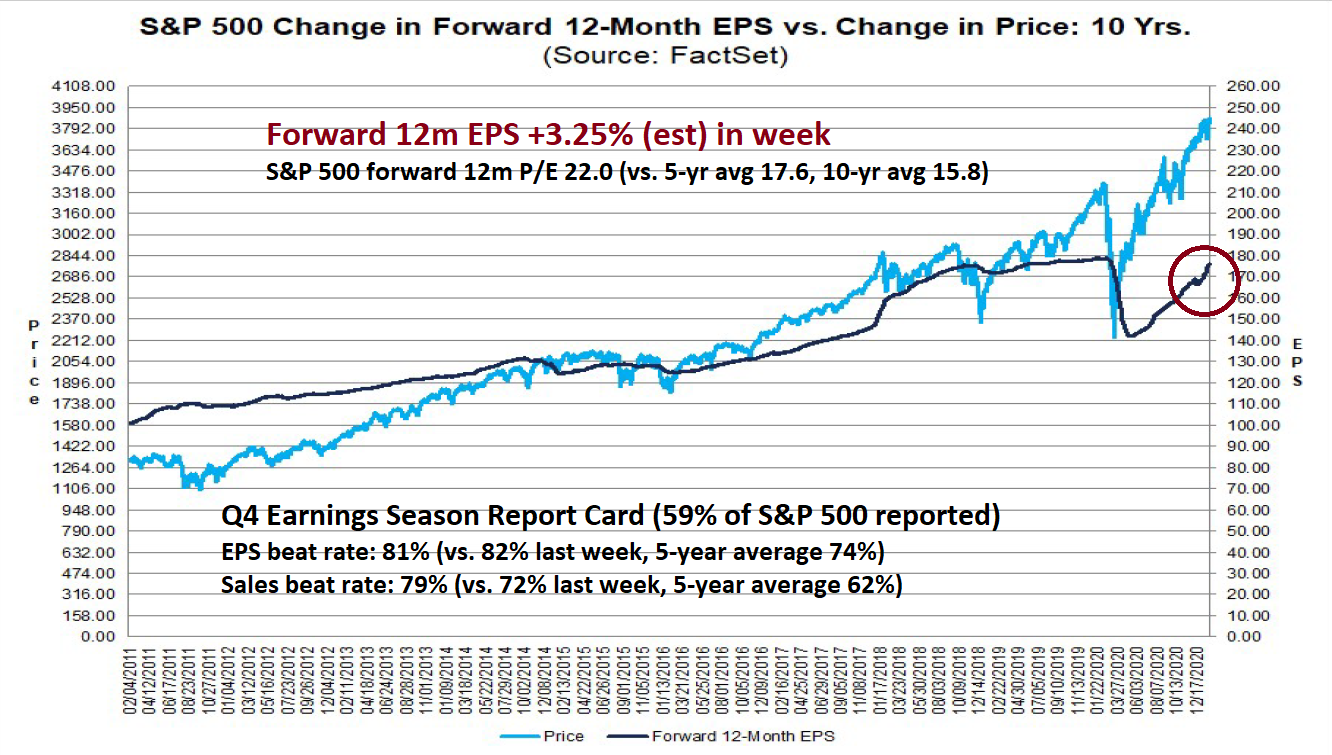 Q4 earnings season is in full swing, and results are strong. With 59% of the S&P 500 having reported, both the EPS and sales beat rates are well ahead of historical averages. Moreover, forward 12-month EPS estimates surged 3.5% in a single week.