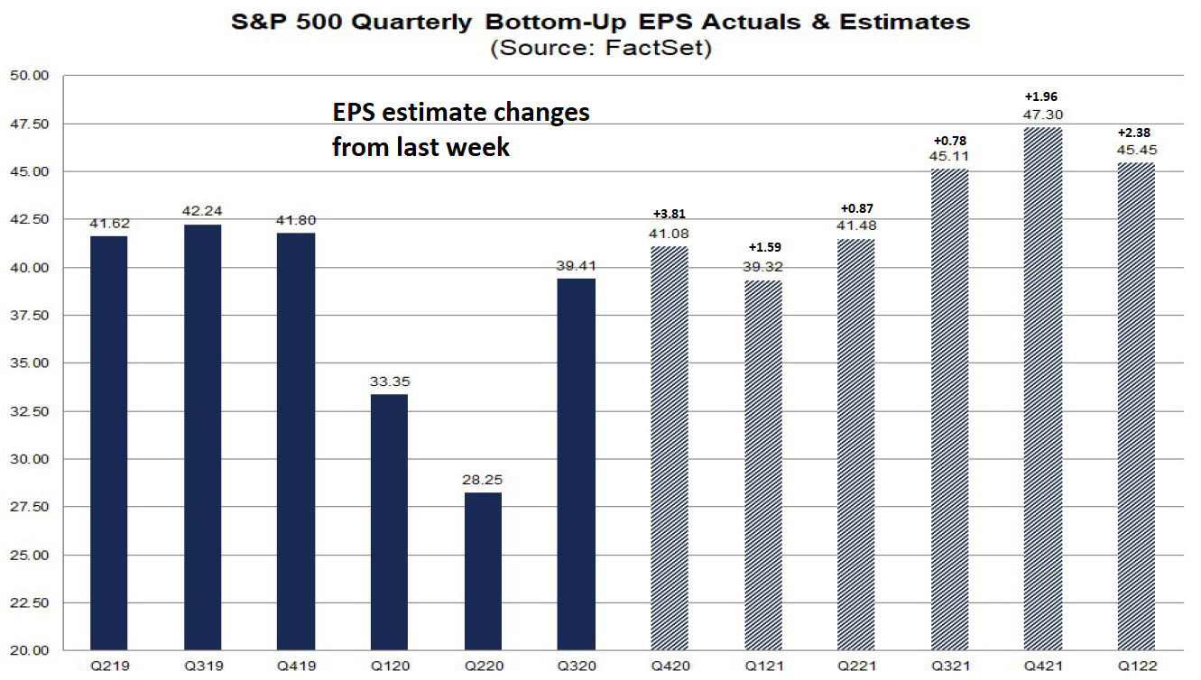 First, the good news. If we drill down to the quarterly EPS level, estimates are rising strongly across the board. In particular, Q4 estimates are seeing a surge in estimate revision. Q4 estimates rose 3.81 to 41.08 last week, an astounding 10.8%. Moreover, FactSet reported that the Q1 positive guidance is 64%, which is well ahead of the 5-year historical average of 33%.