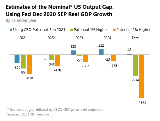 The Biden administration believes the US faces existential threats in the form of a global pandemic and climate change which necessitates an FDR-era Big Government activist response. Biden learned his lesson from the negotiations over Obama’s 2009 stimulus bill, whose effects were smaller than originally envisaged. As well, the “output gap” is a difficult figure to estimate, much like the natural unemployment rate that the Fed used to steer monetary policy. As an example, a study by ISI-Evercore found that if we use the CBO’s economic potential to estimate output gap but the Fed’s GDP economic growth path, the output gap is closed in 2022.
