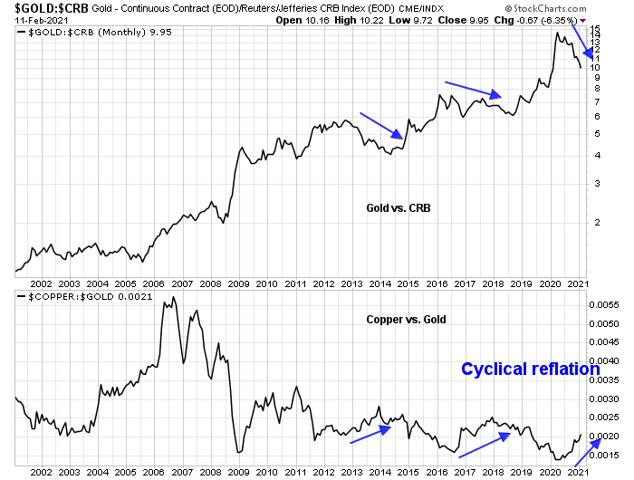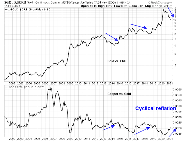For investors, the secular vs. cyclical inflation debate is irrelevant and an academic exercise. From a technical perspective, the chartist could argue that when gold outperforms the CRB Index, it is a sign that inflationary expectations are rising. When gold lags the CRB, and in particular when the copper/gold ratio rises, it is a sign of cyclical reflation.