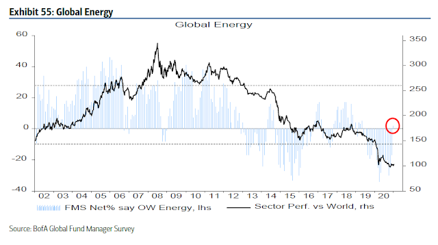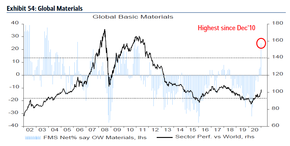 Here is another reason to favor energy over material stocks. Even if you wanted to participate in the upside of a commodity supercycle through resource extraction stocks, the enthusiasm for materials over energy stocks is substantial from a relative value and fund flows perspective. The latest BoA Global Fund Manager Survey shows that global investors have been raising their weights in both sectors, but they are already in a crowded long in materials, while their energy sector weight is only at a neutral level.