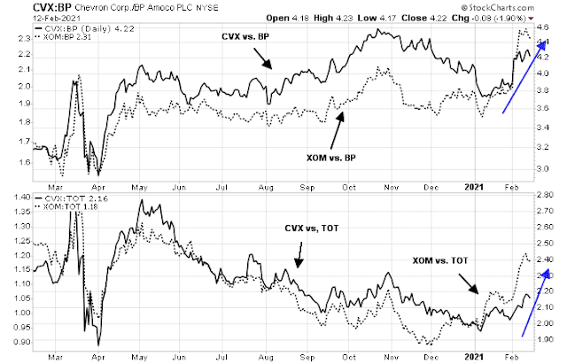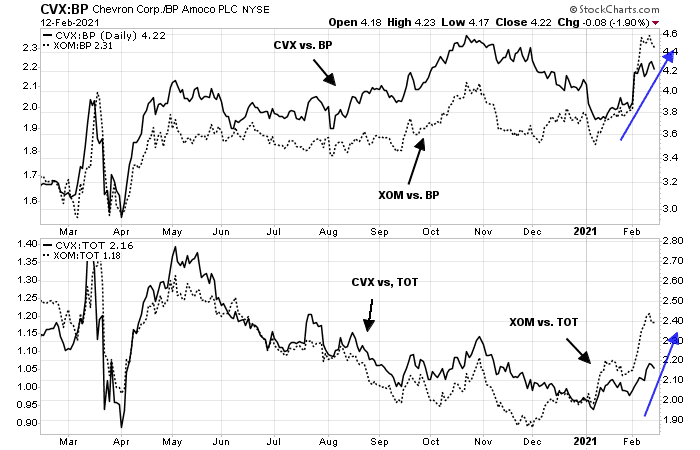 The market response to corporate initiatives to diversify into green and alternative energy also tells a bullish story of legacy energy producers. Contrast the attitude of European companies like BP (BP) and Total (TOT), which recently paid substantial premiums to buy into UK offshore wind farms, to the more conservative views of American giants like Chevron (CVX) and Exxon Mobil (XOM). The relative performances of BP and TOT to CVX and XOM also tells the story of the market’s assessment of the two strategies.