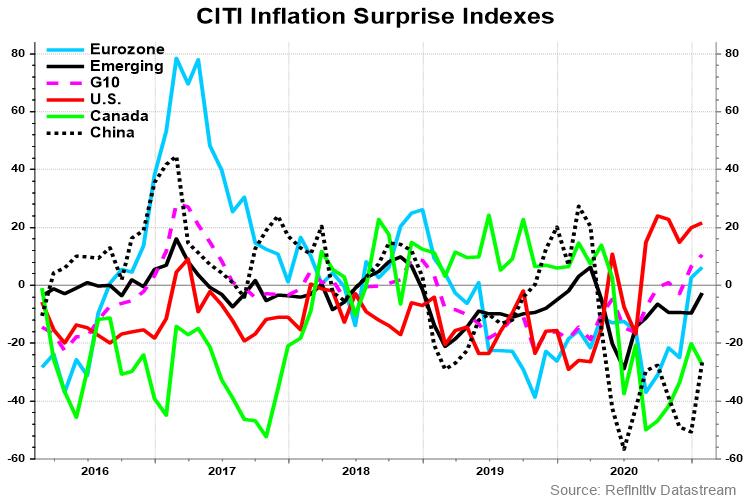 The debate started by Larry Summers is over the secular path of inflation. At a minimum, these conditions call for a cyclical rise in inflation. Indeed, the US Inflation Surprise Index (red line) has been elevated since mid-2020, and inflation surprises have recently spiked all over the world.