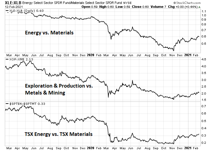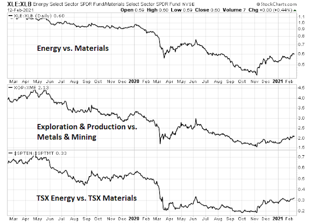 It’s time to reveal the mystery chart, which is the ratio of energy stocks to material stocks. Since the materials sector is relatively small and has non-mining companies such as steel, the second panel of the accompanying chart shows the ratio of oil & gas exploration and production companies to mining. The bottom panel shows the ratio of TSX energy to material stocks listed in Toronto, which has a broader sample of companies in both sectors. The patterns are all similar. Energy had been lagging materials, but it is in the process of making a saucer-shaped relative bottom.