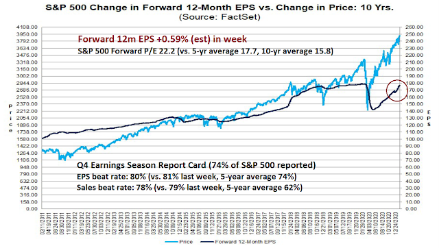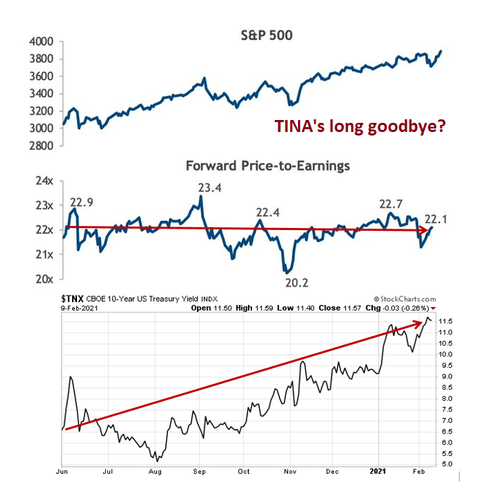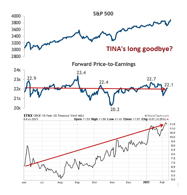 Keith Lerner at Truist Advisory Services observed that the S&P 500 has been rising since last June, but the market’s forward P/E ratio has been steady. This indicates that forward EPS estimates have been rising in line with stock prices, which is constructive for the bull case. What he neglected to mention is that the 10-year Treasury yield has risen about 0.5% during the same period, which makes fixed-income instruments more competitive with equities. In order for stock prices to rise, EPS estimates need to rise at the same pace or more than the stock index. Otherwise, the strength of the TINA (There Is No Alternative to stocks) investment theme will fade.