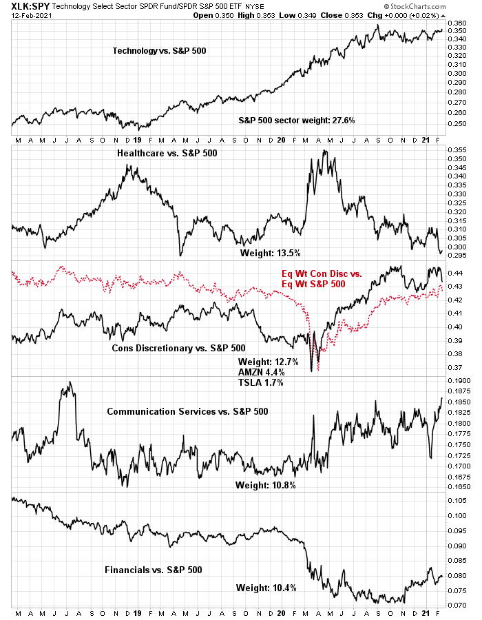 A glance at the market internals of the top five sectors shows the bulls getting a second wind. These sectors represent about 75% of S&P 500 index weight, and it would be impossible for the market to advance or decline without the participation of a majority of these sectors. The relative performance of the Big Tech sectors (technology, communication services, and selected consumer discretionary stocks) are all turning up, along with financial stocks.