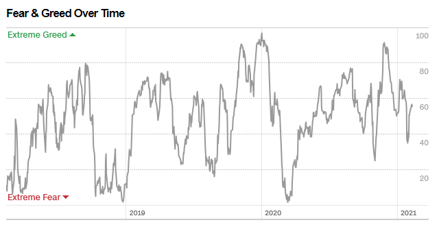 Sentiment model conditions are still excessively bullish but they are mostly off the boil. The Fear & Greed Index is recovering after falling, but readings are still in neutral territory and not excessively bullish.