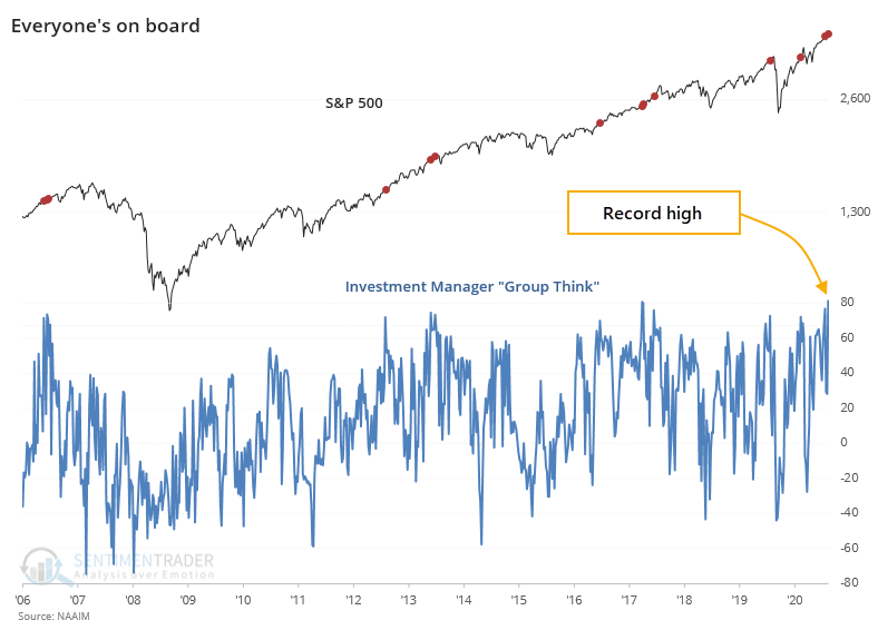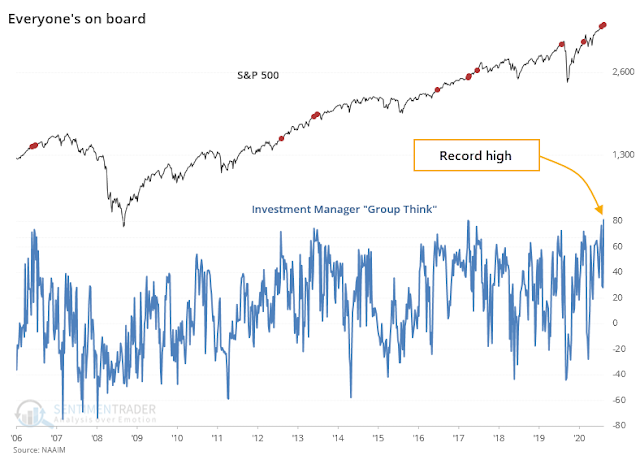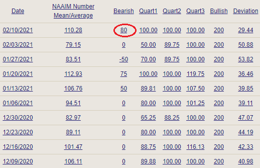 NAAIM Exposure Index, which is a survey of RIAs managing client funds. The latest survey shows that the most bearish respondents are 80% long the market, which is astounding.
