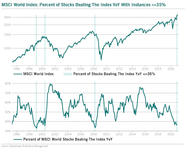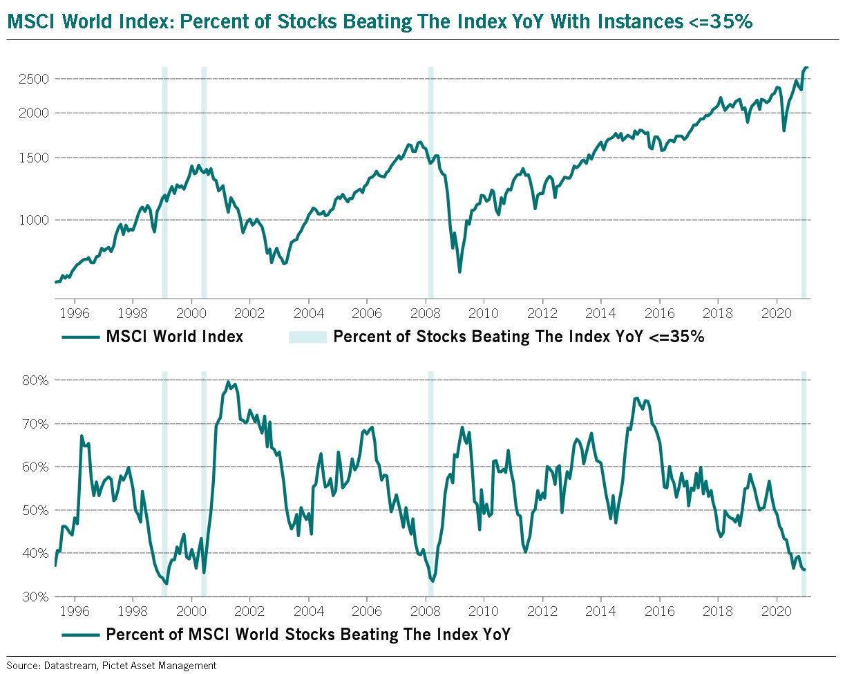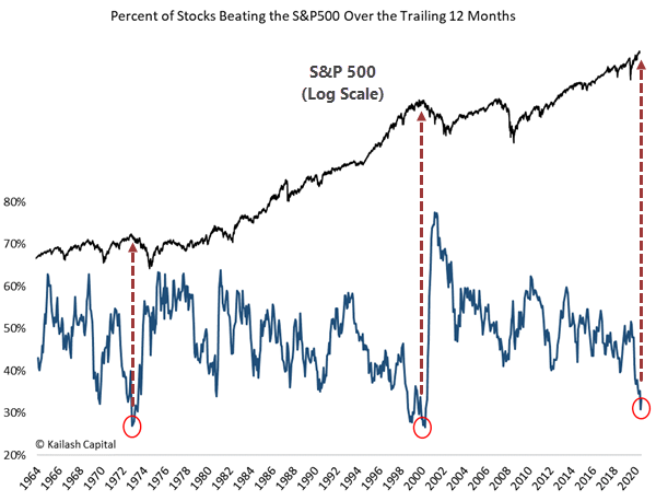 On the other hand, leadership is narrowing, and that’s a concern from a longer-term perspective. The percentage of stocks beating the S&P 500 has dropped to historic lows.
