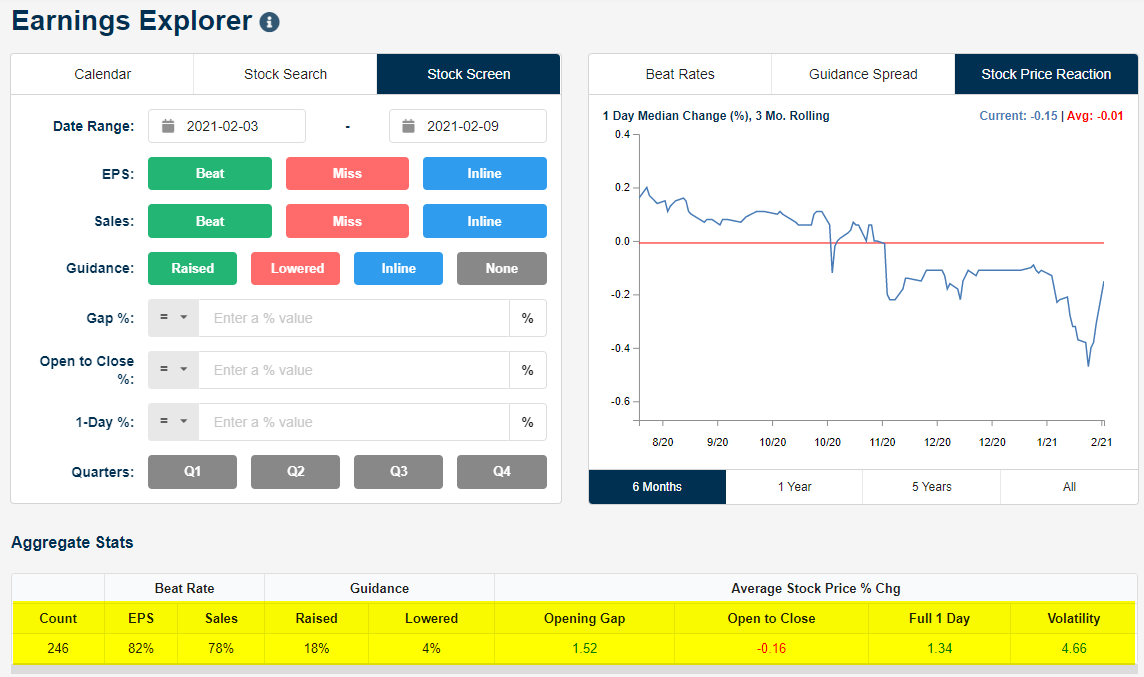 Bespoke reported that stock prices had been falling in reaction to earnings reports but improved sharply in the week ending February 9, 2021. The one-day price reaction to earnings report for that week was a positive 1.34%, which was considerably better than the earlier periods.